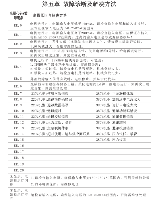 ER.0 :電機運行時,電源輸入電壓低于140VAC,請檢查輸入電壓和輸入連接線應(yīng)保證在輸入電壓為150-250VAC范圍內(nèi)。
