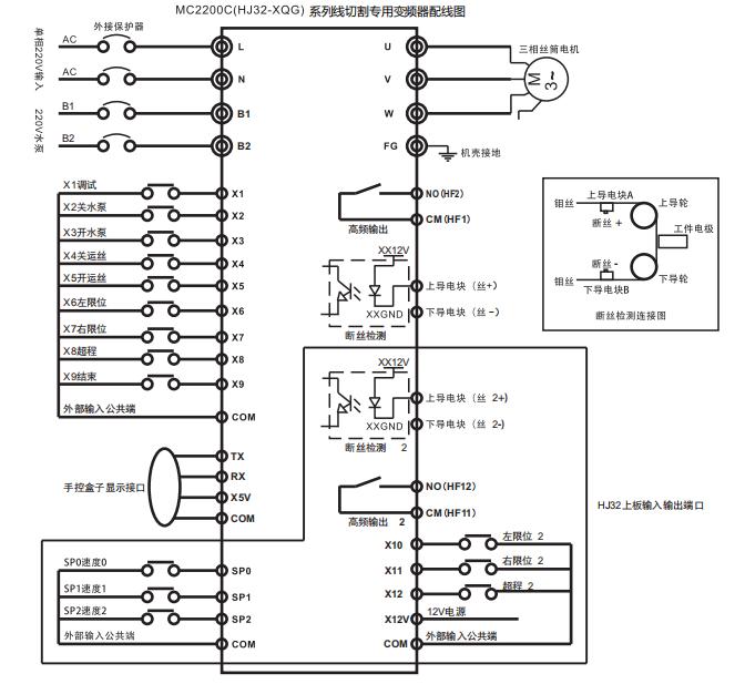 MC2200C /HJ32、MC3300/HJ33 線切割專用變頻器是我司針對(duì)線切割機(jī)床市場(chǎng)推出的一系列專用變頻器,集成了傳統(tǒng)通用變頻器功能+PLC(單片機(jī)控制)功能+外置手控盒功能;使用我司MC2200C/HJ32、MC3300/HJ33 系列線切割專用變頻器只需將外部信號(hào)直接接入相對(duì)應(yīng)端口即可實(shí)現(xiàn)所有控制,與通用變頻器相比省去眾多不必要的參數(shù)設(shè)置,安裝接線使用更簡(jiǎn)單方便。